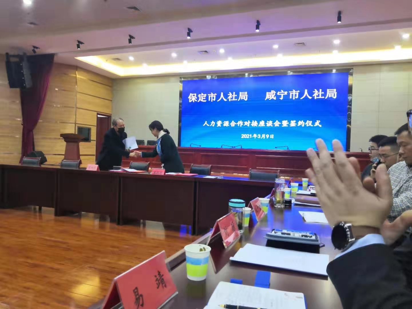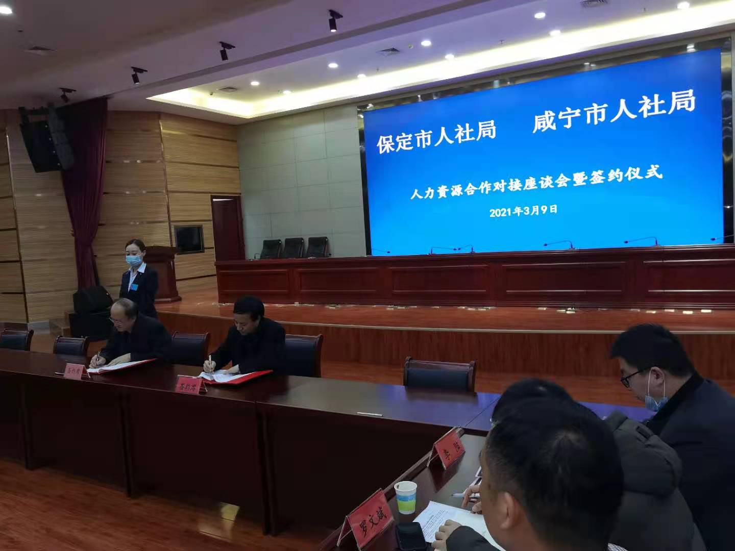3月9日,咸宁市人社局郭铁华同志一行到河北省保定市人社局洽谈人力资源合作,并举行了人力资源合作协议签订仪式。