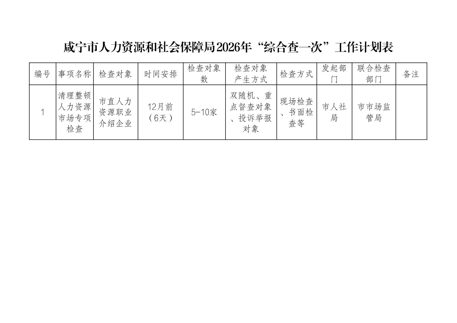 咸宁市人力资源和社会保障局2026年“综合查一次”工作计划表